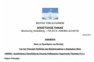 Κοινοβουλευτική παρέμβαση του Βουλευτή Χαλκιδικής Πάνα Απόστολου με θέμα: Διεκδικήσεις Πανελλήνιας Ένωσης Καθηγητών Γερμανικής Γλώσσας Π.Ε. (30.05.2022)